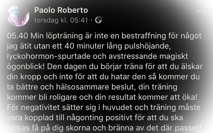 Inte tänker jag som Roberto, men tänk om det är kärleken till kroppen som gör att det blir både lätt och roligt att träna.