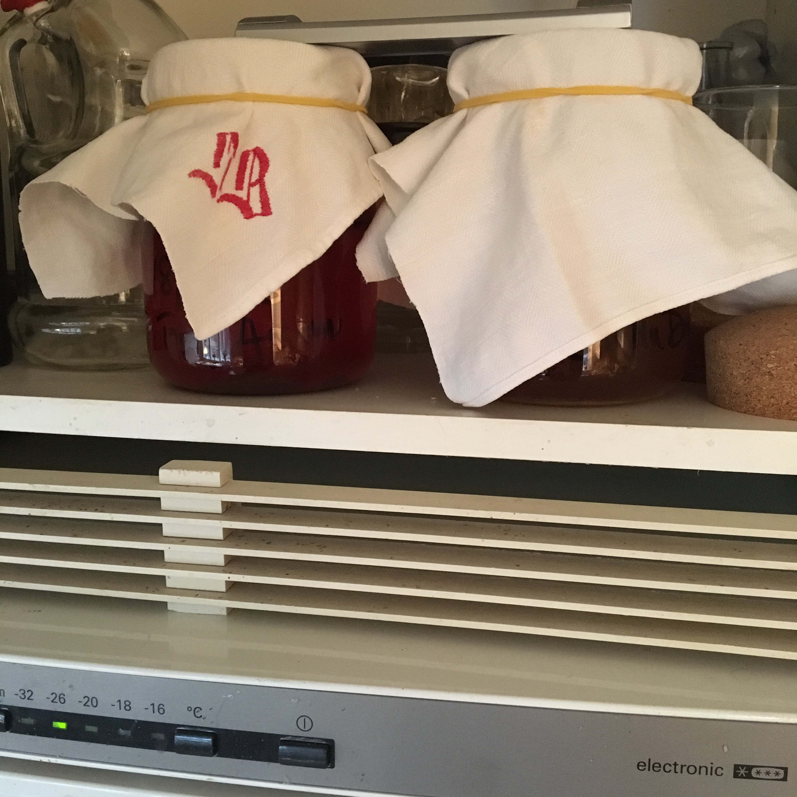 Jag tog fasta på det sista, att de små ”invånarna” (bakterierna och jästen) vill ha det lite varmt och skönt. Så jag ställde burkarna i skåpet ovanför frysen. Men jag ser att med stängd dörr går temperaturen därinne upp till 28 -29 grader och jag misstänker att vätskan i botten på burken kan vara uppåt 30 grader.