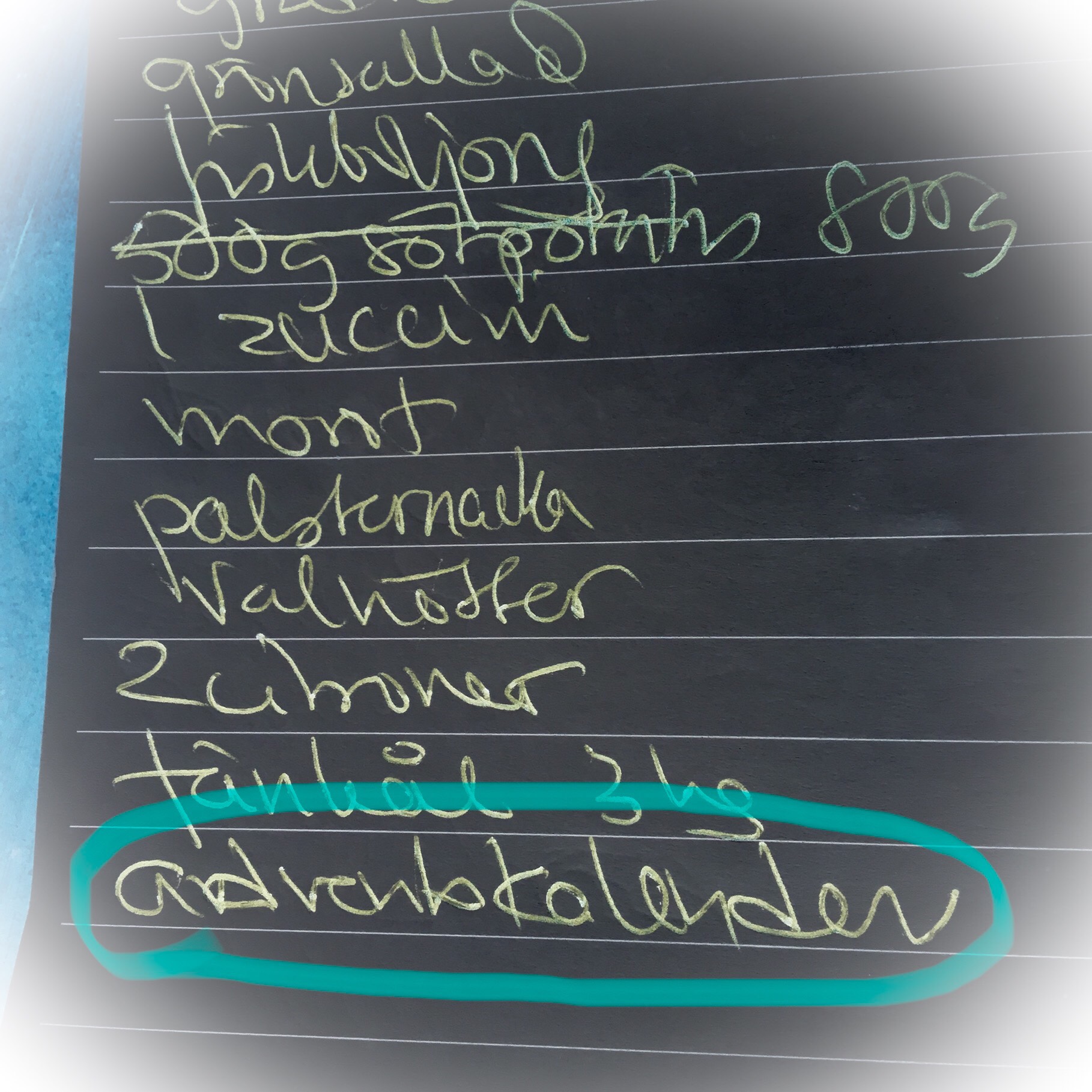 Jag noterar ”adventskalender” på köpelistan. Barnsligt? Ja,eventuellt. Men barnbarnen kommer att slåss om lucköppning de mornar de äter frukost här. Och alla andra mornar kan jag öppna själv, utan bråk. Mysigt och uppfriskande sätt att börja dagen, innan hunden ska ut och djuren fodras.