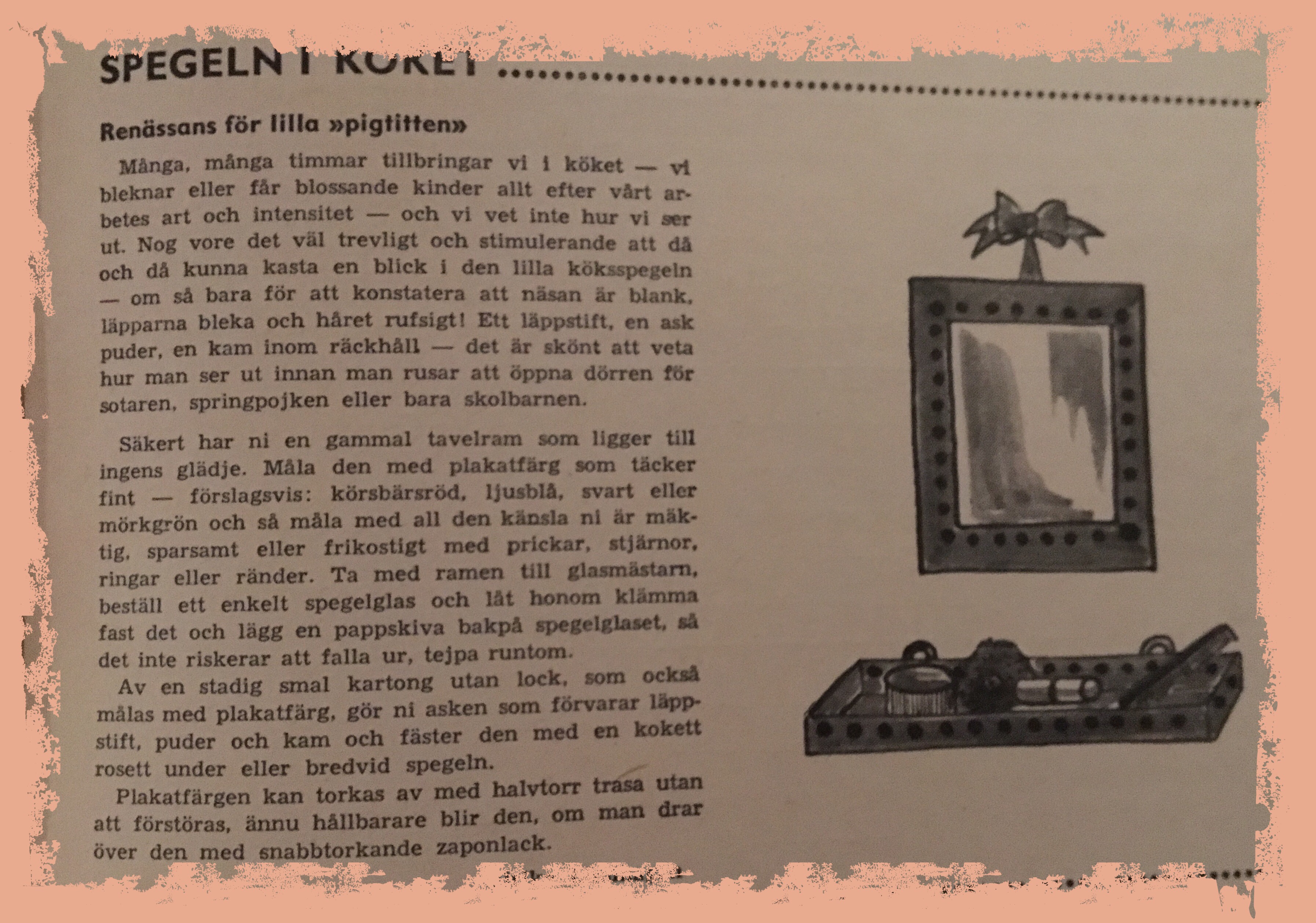 Om jag har spegel i köket och läppstift, puder och kam på den lilla hyllan under? Självklart – det är så skönt att veta hur jag ser ut innan jag rusar och öppnar dörren för sotaren, springpojken eller bara Holger och Milla.