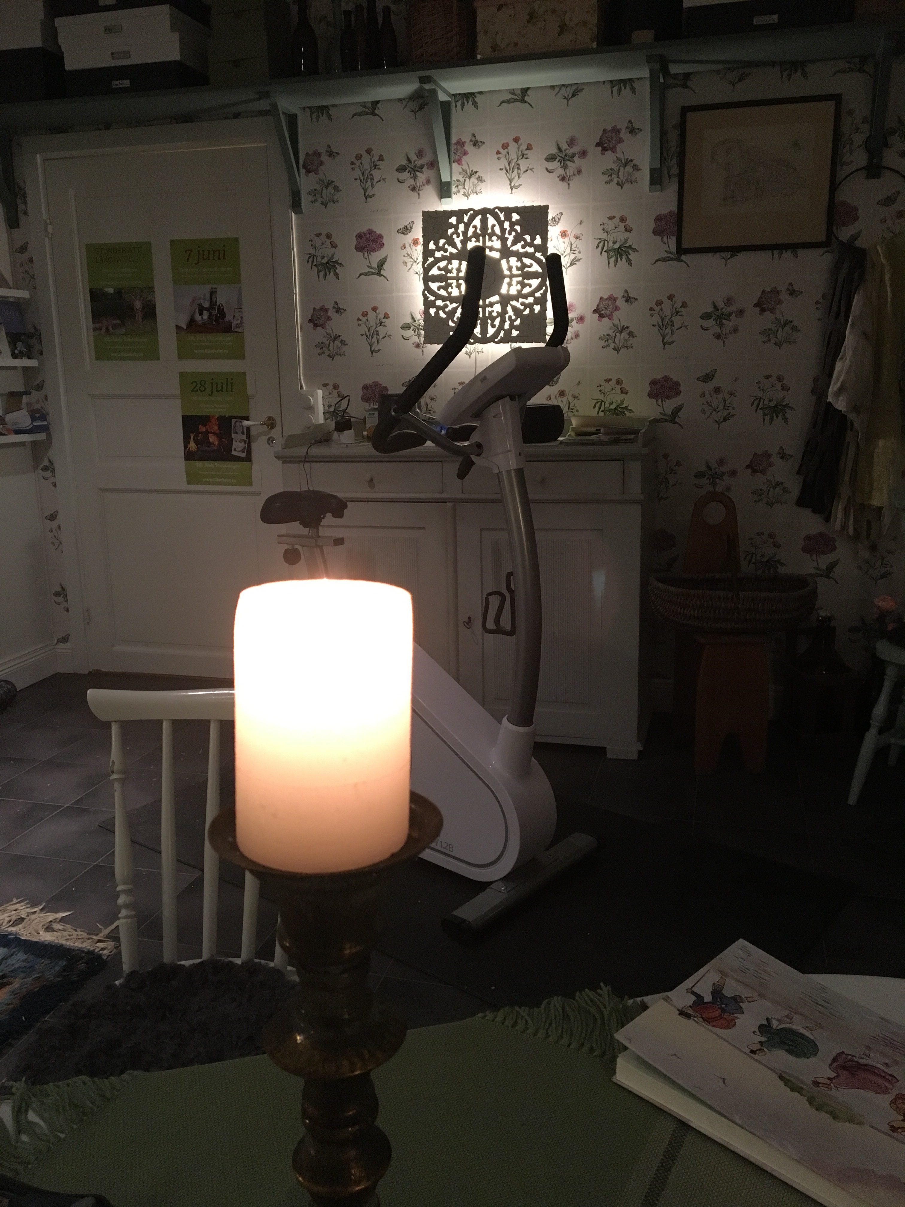 Igår kväll var stillheten med mig nere i ateljén. Jag trampade 9,7 km på motionscykeln. Det tog 25 minuter. Hade inte så mycket motstånd.