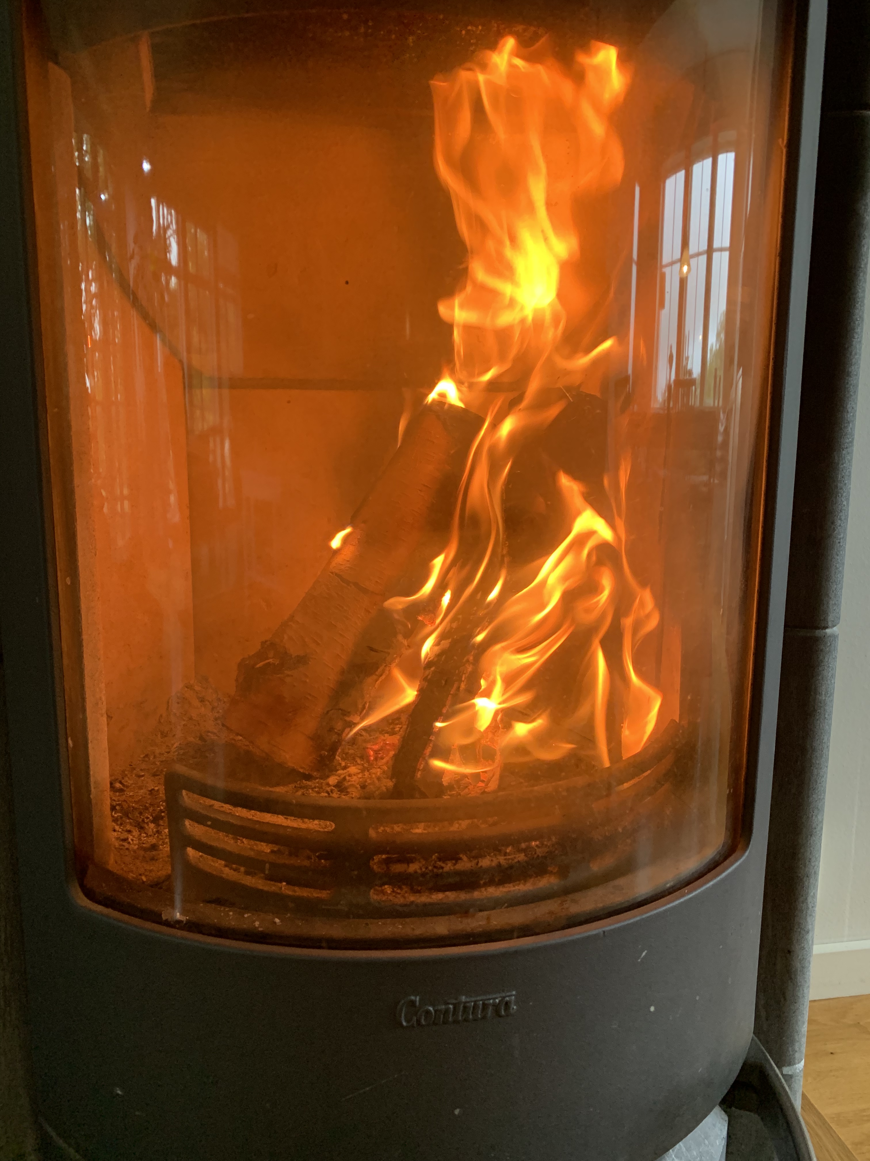 För en stund sen tände jag höstens första brasa i kaminen. Välsignar den torra veden. För i år, och för omväxlings skull, rökte det inte in. Det bara brann.
