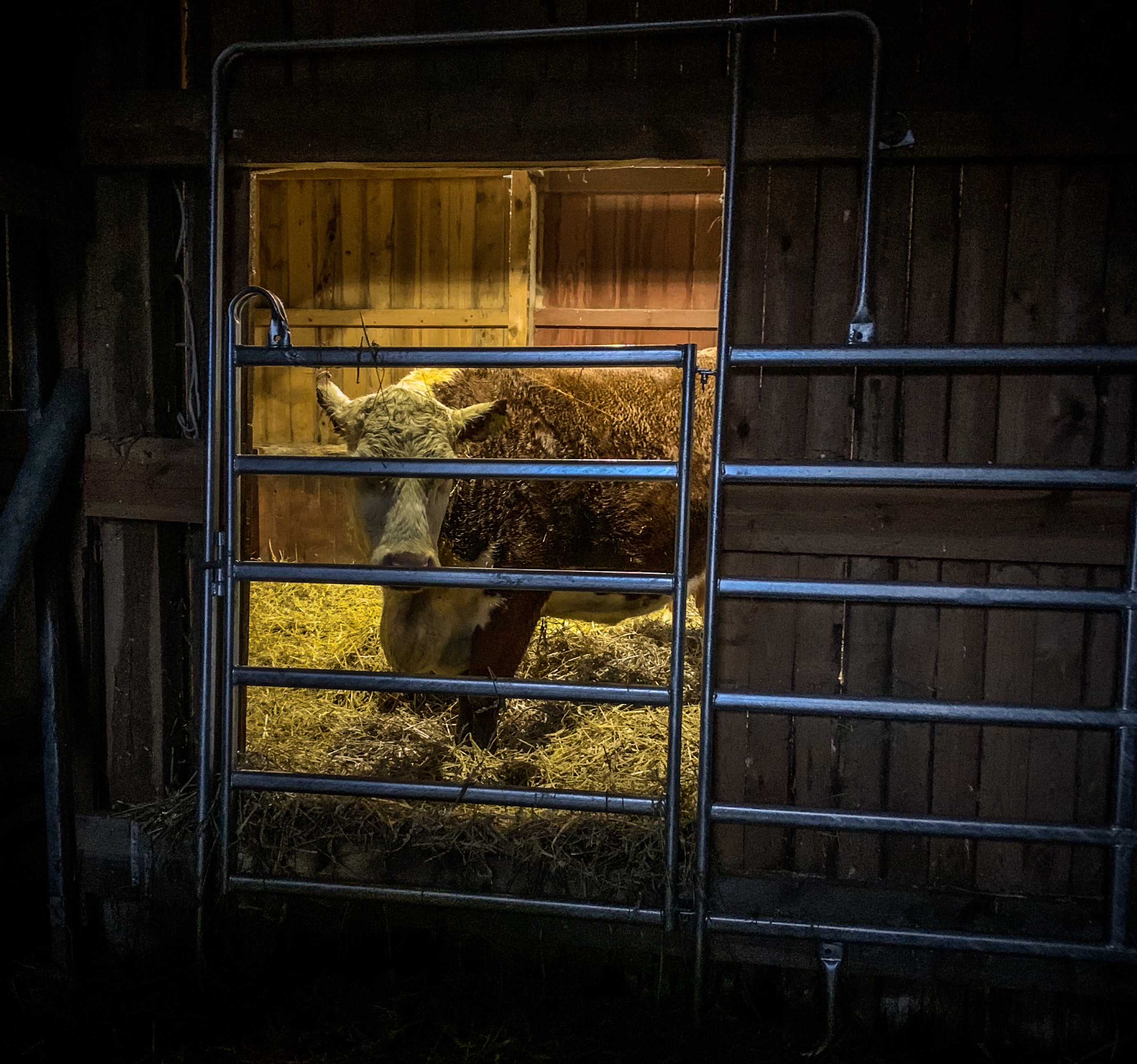 Foderhäcken placering är en av de förbättringar vi gjort sen förra vintern. En annan förbättring är den ”magiska” grinden mellan djurens ligghall och fd traktorgaraget.