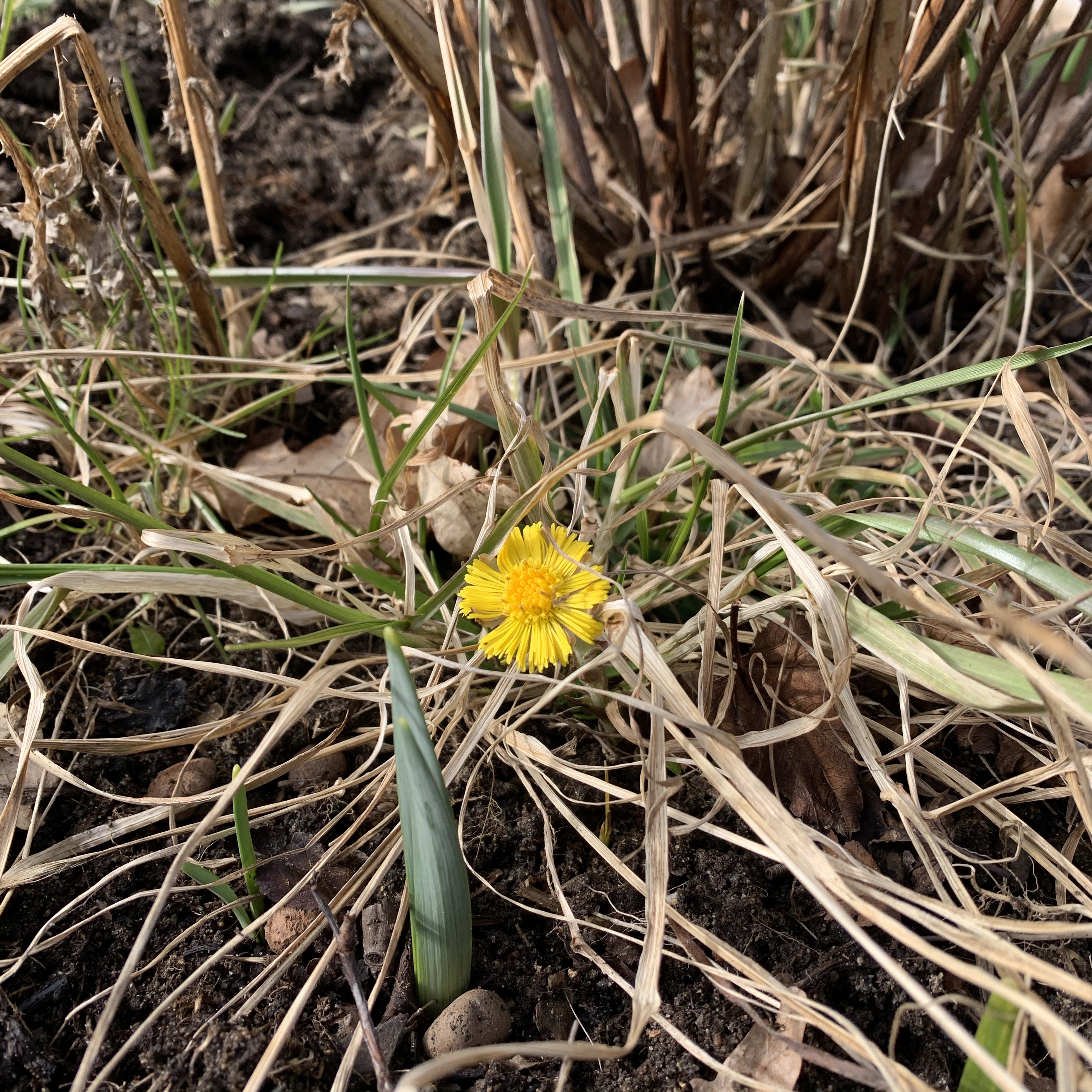 Tussilagon har hittat in i en misskött rabatt. Ljuvliga lilla blomma. Helt okej att du tittar upp där.
