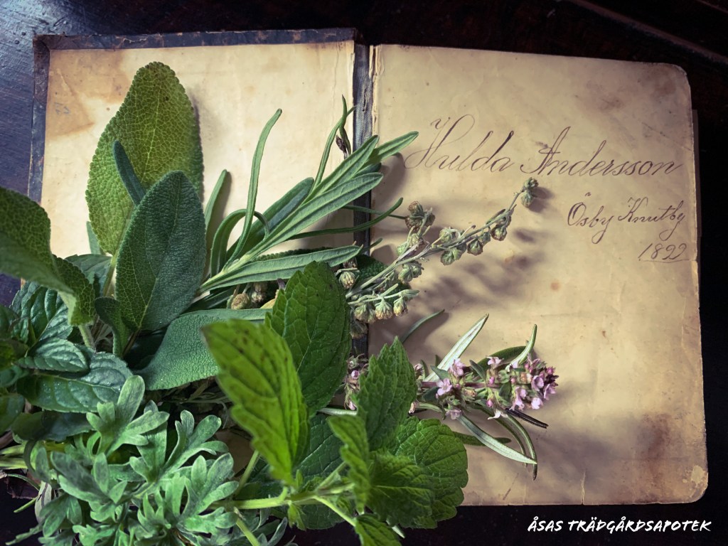 Vilka var örterna? Jag kan tänka mig att man tog det som fanns till hands. Men de som vanligtvis nämns är renfana, åbrodd och malört (för de starka dofterna), citronmeliss och lavendel (för att de doftar gott) myntor av alla de slag (för att de är uppiggande). Andra jag läser mig till är salvia, åbrodd, liljor och rosor.